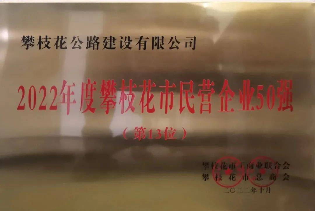 近日,經攀枝花市工商業聯合會(總商會)評審,攀枝花公路建設有限公司入圍“2022攀枝花企業50強”第13位。這是公司自2020年以來,連續三年名次提升。其中,2020年為第20位,2021年為第14位。充分展現了公司在生產經營和創新發展上取得的可喜業績。